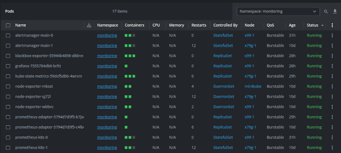 Un petit tour dans le namespace monitoring nous confirme la présence des pods :